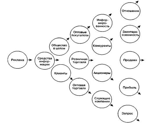 Принцип бильярдного шара (рис. 7.11) используется для формирования и раскрытия экономического эффекта рекламы. Согласно этому принципу именно от силы (величины затрат) первой рекламной кампании зависит экономическая эффективность распространения рекламы. 7.2. Медиа и инструментарий коммуникативной политики 515 Основополагающей функцией рекламы является определение предмета (товара, услуги) и выделение его среди других. Не менее важными функциями рекламы являются: передача информации о товаре, его качествах и месте реализации, побуждение потребителя к апробации нового продукта и его повторному употреблению, стимулирование распространения товара, развитие предпочтения и приверженности потребителя к определенной марке. В общем, все функции рекламы могут быть сведены в отдельные группы: маркетинговую, коммуникативную, образовательную, экономическую и социальную. С точки зрения маркетинговой функции общим предназначением рекламы является стимулирование сбыта и продвижения товара, при этом должна соблюдаться тенденция снижения затрат на продвижение товара от производителя (посредника) до конечного потребителя. Коммуникативная функция рекламы связана с передачей группе людей, организации какого-либо сообщения, информации. Такую же функцию выполняют торговые знаки, которые помогают потребителю выбрать тот товар, который ему нужен. Образовательная функция рекламы заключается в воздействии ее в качестве средства обучения. Клиенты, покупатели узнают о товарах, услугах и открывают для себя способы совершенствования жизни. Реклама (в этом контексте) ускоряет адаптацию нового и неопробованного товара, а также процесс передачи достижений научно-технического прогресса в реальную жизнь. Реклама учит общество не только новому, но и рационализации, сбережению ресурсов, охране и безопасности; она побуждает к действию через человеческую мотивацию. Экономическая функция рекламы заключается в стимулировании объема продаж, развитии торговли, коммерции. Благодаря эффективной рекламе снижаются расходы и растут прибыли, которые можно инвестировать в развитие промышленности или социальной инфраструктуры. Реклама в экономическом смысле служит своего рода фильтром, который дает дорогу только товарам качественным и отсеивает некачественную продукцию. Тем самым повышается производительность, растет надежность товаров, улучшаются их свойства. Социальная функция рекламы состоит в воздействии ее на общество, как позитивном, так и негативном. Она способствует повышению жизненного уровня населения, популяризирует материальные, социальные, экологические и культурные возможности рыночной экономики, защищает потребителей от вредных товаров. Реклама способствует также развитию средств массовой информации, общественных организаций, компаний, некоммерческих организаций, формирует культурный, правовой и экономический менталитет каждого члена общества. Для осуществления процесса рекламы и рекламных кампаний должен функционировать следующий комплекс взаимосвязанных элементов: рекламодатели, которые иногда используют рекламные агентства для рассылки своих обращений через средства рекламы, чтобы с ними ознакомились потенциальные потребители этих обращений — как минимум, а зачастую и самих рекламируемых товаров и услуг. 516 