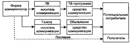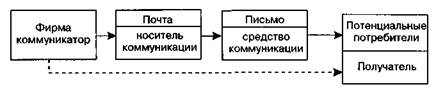 Рис. 7.14.Одноступенчатый процесс прямою маркетинга приемнику. Многоступенчатые коммуникации реализуются с помощью средств массовой информации, которые создают возможность обратной связи (купоны, радиопередачи, телепрограммы, сигнальная реклама). Прямой маркетинг имеет ряд особенностей, к которым главным образом относят: • целевую направленность контакта; • непосредственное (прямое) общение с покупателем; • индивидуальность коммуникативных связей; • возможность обратной связи с коммуникатором.