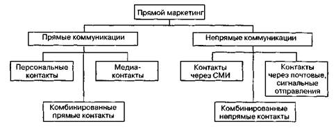 Рис. 7.16.Элементы системы прямого маркетинга В этом случае важную роль при проведении прямого маркетинга играет использование инструментария сбытовой политики (сбытовой, продуктовый и договорный маркетинг-микс). В качестве целевых групп в прямом маркетинге могут выступать конечный потребитель, торговые предприятия, промышленные потребители, непромышленные потребители (организации, школы, церковь и т. д.). Типология прямого маркетинга классифицирует коммуникации на прямые и непрямые (рис. 7.17). Прямые коммуникации проводятся с помощью персональных медиа или комбинированных контактов. Непрямые коммуникации осуществ-
