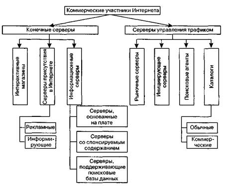 Рис. 7.19.Классификация коммерческих участников Интернета возможна реализация индивидуального подхода к каждому клиенту с учетом его посещений магазина и совершенных им покупок. Главной проблемой реализации интерактивной модели магазина являются невысокие скорости доступа к WWW, что делает интерактивные покупки достаточно утомительными. Серверы присутствия в Интернете обеспечивают виртуальное присутствие фирм и их предложений в среде Интернета. Серверы этого типа делятся на два вида: рекламный и информационный. Рекламный сервер может состоять из одной или нескольких web-страниц и содержать различную рекламную информацию. Информация относительно продуктов или услуг фирмы обеспечивается в контексте, в котором они имеют значение для потребителя. Такой тип сервера особенно подходит для продуктов, для представления которых не требуется большое количество информации, при этом основное воздействие на потребителей оказывается скорее в эмоциональном, чем в информационном плане. Информирующие серверы обеспечивают детальную информацию относительно фирмы и/или ее предложений. Такие серверы могут иметь довольно разнообразное строение. Для облегчения навигации в случае сложного строения сервера или большого объема представленной информации может использоваться функция поиска. i кип и 1чипцс1 щип wap^c i Kini ad upc/j," r in I cfJnc I ct Одна из целей серверов присутствия в Интернете состоит в установлении взаимосвязи с потребителями, прежде чем возникает потребность купить продукт или услугу1. В группе информационных серверов можно выделить следующие виды: • серверы, основанные на плате; • серверы со спонсируемым содержанием; • серверы, поддерживающие поисковые базы данных и получающие плату от При организации серверов, основанных на плате, провайдер поставляет и/или платит за формирование содержания (информации), за доступ к которому потребитель вносит определенную плату. Основной проблемой реализации такого сервера является задача предоставления уникальной информации, поскольку Интернет является информационно-интенсивной средой, где существует много альтернатив поиска требуемой информации. Серверы со спонсируемым содержанием продают рекламное пространство для обеспечения своего существования и устранения таким образом каких-либо платежей со стороны посетителей. Существует тенденция распространения серверов со спонсируемым содержанием, главной задачей которых являются обеспечение времяпровождения пользователей и спонсирование популярных машин поиска. Некоторые спонсируемые серверы комбинируют элементы модели сервера присутствия в Интернете и модели рыночного сервера. В случае использования поискового сервера данных фирмы оплачивают провайдеру размещение информации в организованном списке поисковой базы данных. Предметом поиска могут быть продукт, сервис, услуга, какой-либо информационный источник и т. д. Возможности информационных серверов огромны, по< кольку они близки к традиционным моделям средств коммуникаций. В настоя ' с время в большинстве случаев либо не взимается вообще никакая плата за пользование информацией серверов (полностью спонсируемое содержание), либо эта плата минимальна (содержание, основанное на плате). Цель серверов управления трафиком — направить потребителей к конечным серверам, ко