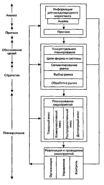 Рис. 8.4.Процесс принятия решений в международном маркетинге [Р. Келлер, X. Мефферт, 1982] 640 Глава 8. Основы организации международного Результаты анализа зарубежной среды используются при разработке обоснованного прогноза вероятности или возможности дальнейшего изменения рыночной конъюнктуры на международном рынке, обусловленного динамикой факторов окружающей среды. Так как решения в международном маркетинге носят долгосрочный характер, обоснованный прогноз имеет важное функциональное значение. Поэтому особая роль в достижении успеха тактических мероприятий по обработке рынка в международном маркетинге отводится стратегическому планированию. Такое планирование носит концептуальный характер и тесно связано с принципами выбора рынков и решением проблем применения маркетингового инструментария в той или иной стране в течение длительного периода. Решение проблем планирования и принятия решений в международном маркетинге предполагает формулировку и обоснование специфических маркетинговых целей предприятия и всей системы коммуникации на международном рынке. В рамках глобальных целей, таких как прибыль и безопасность, определяют стратегические цели маркетинга для конкретной страны (например, доля рынка, доля проникновения на рынок, величина товарного оборота). Разработанный исходя из этих целей план должен включать ряд вопросов: чего и с помощью каких средств можно достичь в течение определенного периода на том или ином зарубежном рынке? Обоснование целей является базой для разработки стратегий, которая включает сегментацию, выбор и обработку рынка. Сегментация рынка позволяет выявить различия между покупателями рынков мировых и страны и разделить общий рынок на различные в зависимости от цели рыночные сегменты. При этом в качестве критериев сегментации могут выступать международные (географические, языковые, климатические, экономические и др.) и внутринациональные (пол, возраст, доход, отношение к покупке и др.) показатели. Отбор сегментов страны и потребительских сегментов рынков осуществляется с помощью наиболее подходящих методов (см. главу 2). Обработка международного рынка — наиболее трудоемкая процедура использования инструментов международного маркетинга. При этом решения, касающиеся стандартизации или дифференциации избранных рынков, должны приниматься в первую очередь. Обоснование и выбор конкретных инструментов международного маркетинга осуществляются на стадии планирования, которая включает планирование мероприятий в рамках всего комплекса маркетинга. Планирование предполагает установление объема, вида и последовательности мероприятий по обработке рынка или его сегментов в отдельных странах. Как и в национальном маркетинге, в этом случае используются такие инструменты маркетинга, как товарный микс (ассортимент, марка, производительность, служба работы с покупателями), коммуникативный микс (формы взаимодействия, реклама, стимулирование сбыта, личная продажа, паблик рилейшнз и др.), распределительный микс (каналы сбыта, логистика и др.) и договорный микс (цены, скидки, кредиты, условия поставки и оплаты). На фазе реализации и осуществления мероприятий плана обращают внимание в первую очередь на развитие эффективных организационных структур, а также на концепцию управления и коорд