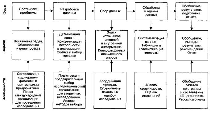 Рис. 8.5.Процесс международного маркетингового исследования Глава 8. Основы организации международного маркетинга ность международного маркетинга и международной деятельности фирмы (см. 8.1). Прежде всего корректируют потребности в информации о международной среде и возможности фирмы для ее получения или приобретения. Обычно потребности фирмы в информации велики, а возможности ограничены. В такой ситуации при проведении маркетинговых исследований необходимы высокая избирательность информации и подбор действительно нужных целевых рынков и рыночных характеристик. Для систематизации процесса поиска, а затем и обработки данных могут использоваться логические схемы, позволяющие вести последовательный поиск и быстро находить методом исключения оптимальны варианты информации. Логические схемы представляют в виде матриц, отражающих состояние внешней и внутренней среды фирмы (рис. 8.6) или состояние субъектов маркетинговой системы и внешней среды (рис. 8.7). Могут потребоваться и другие конкретные матрицы. В зависимости от цели маркетингового исследования и поставленных задач осуществляют выбор той ситуации, которая представляет наибольший интерес. К подведению итогов анализа могут привлекаться в качестве экспертов ведущие специалисты, ученые, потребители и производители. Просматривая всю информацию, отбирают сведения, которые представляют интерес. На основании анализа матриц определяют количественную и качественную потребность фирмы в информации.