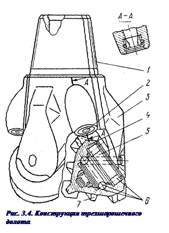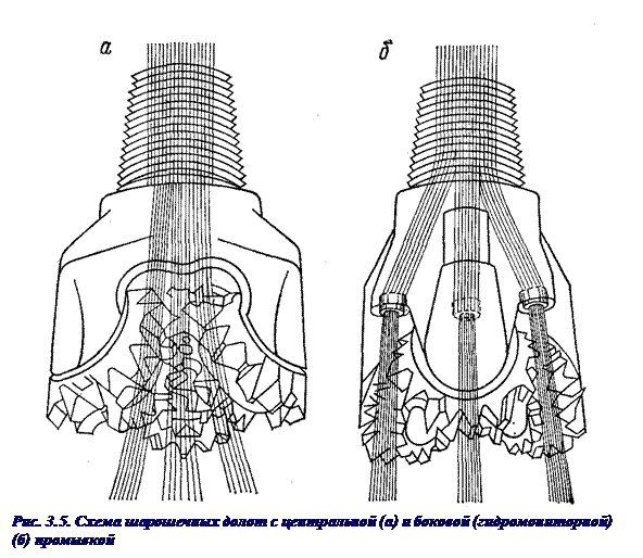 Шарошечные долота изготавливают как с центральной, так и с боковой системой промывки (рис. 3.5.). На лапах долота с боковой гидромониторной системой промывки выполнены специальные утолщения – приливы 2 с промывочными каналами и гнездами для установки гидромониторных насадок (сечение А-А).