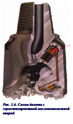 При центральной промывке забоя лучше очищаются от шлама центр забоя и вершины шарошек, шлам беспрепятственно выносится в наддолотную зону. Однако при высокой скорости углубки забоя трудно подвести к долоту необходимую гидравлическую мощность, требуемую для качественной очистки забоя (перепад давления на долотах с центральной промывкой не превышает 0,5-1,5 МПа). Боковая гидромониторная промывка обеспечивает лучшую очистку наиболее зашламованной периферийной части забоя, позволяет подвести к долоту большую гидравлическую мощность (перепад давления на долотах с гидромониторной промывкой достигает 5-15 МПа). Однако мощные струи бурового раствора, выходящие из гидромониторных насадок экранируют транспортирование шлама через проемы между секциями долота, поэтому часть шлама циркулирует некоторое время в зоне действия шарошек и переизмельчается, а часть – транспортируется в зазорах между стенкой скважины и спинками лап. Поэтому зачастую переходят на ассиметричную систему промывки, заглушая одну или две гидромониторные насадки для повышения пропускной способности основных транспортных каналов долота. Беговые дорожки цапфы и шарошки и тела качения без сепараторов составляют опору шарошки. Помимо подшипников качения опора может включать подшипники скольжения (антифрикционные втулки) и торцевую пяту (антифрикционный диск). Полость опоры заполняется консистентной смазкой. Опоры шарошек – наиболее ответственные узлы шарошечного долота, стойкость которых чаще всего определяет долговечность долота в целом. Опоры воспринимают радиальные и осевые нагрузки (по отношению к цапфе). Опоры шарошек в зависимости от типоразмера долот конструируются из различных сочетаний шариковых и роликовых подшипников качения и подшипников скольжения. Шариковые подшипники легче разместить в ограниченных размерах шарошки, они слабо реагируют на возможные перекосы осей шарошек и цапф. Однако из-за проскальзывания шариков по боковым дорожкам эти подшипники быстро нагреваются и требуют интенсивного охлаждения. Роликовые подшипники могут воспринимать большую, чем шариковые подшипники нагрузку, но труднее вписываются в ограниченные размеры шарошек. Они весьма чувствительны к перекосам осей шарошек и цапф и при износе роликов нередко шарошки заклиниваются на цапфах. Подшипники скольжения способны воспринимать наибольшие нагрузки. Однако эффективны они только при невысоких частотах вращения долота, когда трущиеся поверхности шарошек и цапф и соседних подшипников качения сильно не нагреваются. В каждой системе опор обязательно имеется один шариковый подшипник, называемый замковым радиально-упорным подшипником двухстороннего действия. Он удерживает шарошку на цапфе и воспринимает усилия, направленные вдоль и перпендикулярно к оси цапфы. Устанавливается этот подшипник в последнюю очередь, через цилиндрический канал в цапфе, затем в этот канал вставляется стержень (палец) и его наружная часть приваривается к телу цапфы. Подшипники шарошек в процессе бурения смазываются и охлаждаются буровым раствором, проникающим к ним по зазору между основанием шарошки и упорной поверхностью в цапфе. Поэтому в буровой раствор добавляются специальные реагенты, улучшающие его смазочные свойства. При бурении с продувкой скважины воздухом услови