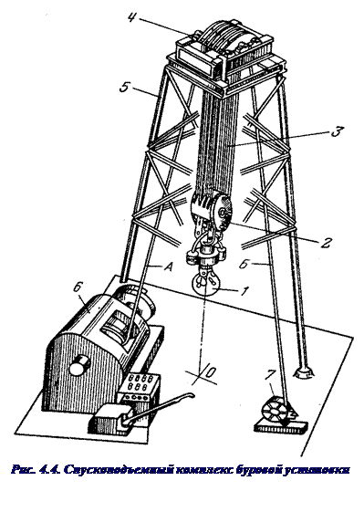 Спускоподъёмный комплекс буровой установки (рис. 4.4.) представляет собой полиспастный механизм, состоящий из кронблока 4, талевого (подвижного) блока 2, стального каната 3, являющегося гибкой связью между буровой лебёдкой 6 и механизмом 7 крепления неподвижного конца каната. Кронблок 4 устанавливается на верхней площадке буровой вышки 5. Подвижный конец А каната 3 крепится к барабану лебедки 6, а неподвижный конец Б – через приспособление 7 к основанию вышки. К талевому блоку присоединяется крюк 1, на котором подвешивается на штропах элеватор для труб или вертлюг. В настоящее время талевый блок и подъёмный крюк объединены в один механизм – крюкоблок.
