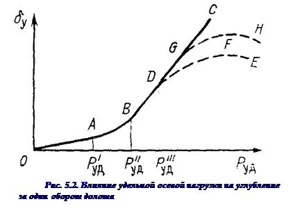 Как видно из рисунка, механическая скорость непрерывно возрастает с увеличением осевой нагрузки, но темп её роста для мягких пород более быстрый, так как больше глубина погружения зубьев при одинаковой нагрузке. На стенде, и в промысловых условиях наблюдается изменение темпа роста Vм от G при переходе от разрушения пород истиранием при небольшой осевой нагрузке к разрушению пород в усталостной и объёмной областях при больших нагрузках. Если скорость вращения долота неизменна и обеспечивается достаточная чистота забоя, величина углубления за один оборот dу возрастает с увеличением удельной осевой нагрузки Руд так, как это показано на рис. 5.2. (кривая ОАВС). При весьма малой нагрузке напряжение на площадке контакта зуба шарошки с породой меньше предела усталости последней; поэтому при вдавливании происходит лишь упругая деформация породы (участок ОА). Разрушение же породы в этой зоне, которую обычно называют областью поверхностного разрушения, может происходить путём истирания и, возможно, микроскалывания шероховатостей поверхности при проскальзывании зубка. Если нагрузка более высокая (участок АВ), то давление на площадки контакта зубка с забоем превышает предел усталости, но меньше предела прочности породы. Поэтому при первом ударе зубка по данной площадке происходит деформация породы, возможно, образуются начальные микротрещины, но разрушения ещё не происходит. При повторных ударах зубков по той же площадке начальные микротрещины развиваются вглубь до тех пор, пока при очередном ударе не произойдёт выкол. Чем больше действующая на зубок сила, тем меньше ударов требуется для разрушения. Эту зону называют областью объёмно – усталостного разрушения. При более высоких нагрузках разрушение породы происходит при каждом ударе зубка. Поэтому участок правее точки В называют областью эффективного объёмного разрушения породы. В области ОА углубление за один оборот dу мало и возрастает очень медленно, пропорционально удельной нагрузке на долото Руд. Под удельной нагрузкой понимают отношение нагрузки на долото G к его диаметру. В области усталостного разрушения углубление растет быстрее увеличения удельной нагрузки и зависимость между ними имеет степенной характер. В области эффективного объёмного разрушения породы углубление за один оборот быстро возрастает – примерно пропорционально удельной нагрузке (или несколько быстрее), если обеспечена достаточная очистка забоя. Характер зависимости между углублением за один оборот долота dу и удельной нагрузкой Руд существенно изменяется, как только очистка забоя становится недостаточной и на нём скапливаются ранее сколотые частицы, которые не успели переместиться в наддолотную зону. Такие частицы дополнительно измельчаются при новых ударах зубков шарошек по забою. Поэтому с ухудшением очистки забоя прирост углубления за один оборот долота с увеличением удельной нагрузки будет уменьшаться. Так, согласно кривой ОАВДЕ, полученной при бурении с секундным расходом промывочной жидкости Q1, углубление за 1 оборот быстро возрастает, до тех пор, пока удельная нагрузка не превышает Р111уд. При нагрузках выше Р111уд прирост углубления сначала замедляется, а затем (правее точки F) углубление за один оборот