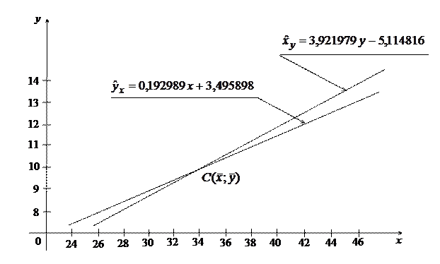 Из рис. 10 видно, что отклонения точек от построенной прямой незначительны. Следовательно, связь между признаками и может носить линейный характер. Составим уравнения линий регрессий на по методу наименьших квадратов и через коэффициент линейной корреляции .