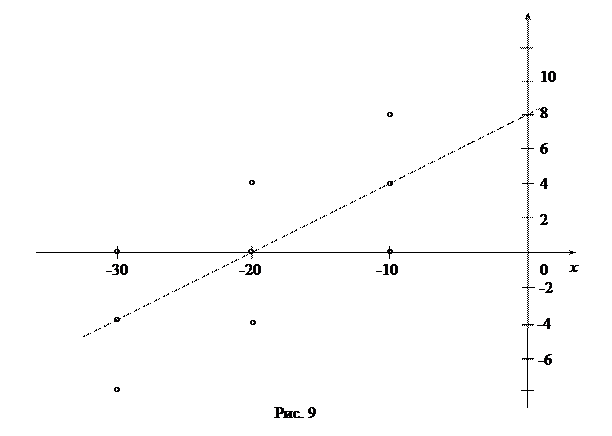 Пусть признак характеризует отклонение размеров валиков от номинала при черновой обработке, а признак отклонение размеров валиков от номинала при чистовой обработке. Используя данные табл. 27, строим корреляционное поле (рис. 9).