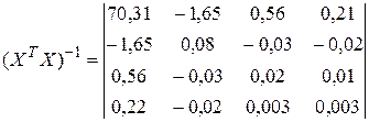где — матрица значений факторных признаков или матрица плана размерности ; — транспортированная матрица ; — матрица коэффициентов системы нормальных уравнений (96) размерности ; — матрица-столбец значений результативного признака размерности ; — матрица-столбец свободных членов системы (97) размерности . Для оценки надежности коэффициентов , , , . . ., находят средние квадратические ошибки этих коэффициентов, то есть находят . Пусть — матрица коэффициентов при переменных системы (97), обратная матрице . Тогда средние квадрвтические ошибки коэффициентов вычисляют по формуле