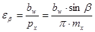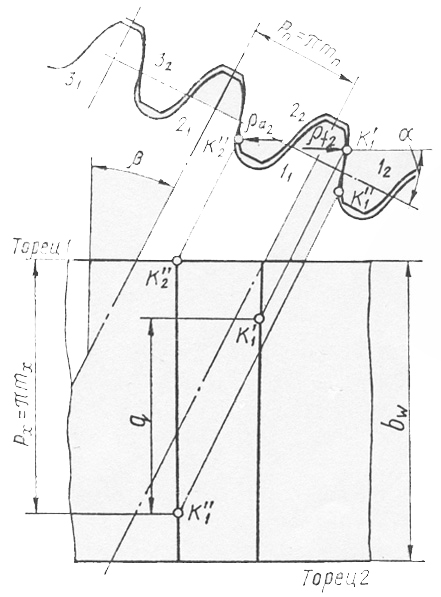 Параметры исходного контура зацеплений Новикова с двумя линиями зацепления (рис. 16.5, б) регламентируется ГОСТ 15023-76. Как и в исходном контуре с одной линией зацепления, профили зубьев в нормальном сечении очерчены дугами окружности и сопрягаются между собой прямолинейным участком. Геометрические параметры определяются через нормальный модуль mn. Модули зацепления выбирают в соответствии со значениями, установленными ГОСТ 14186-69. Непрерывность вращения ведомого колеса в зубчатом механизме с зацеплением Новикова обеспечивается за счет осевого перекрытия. Коэффициент осевого перекрытия определяется отношением рабочей ширины зацепления bw к осевому шагу px (см. рис. 16.6):