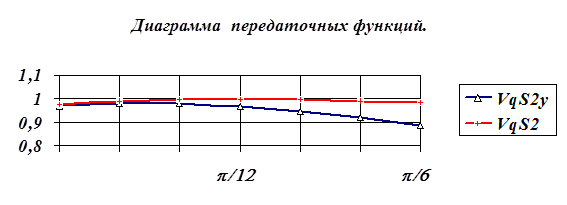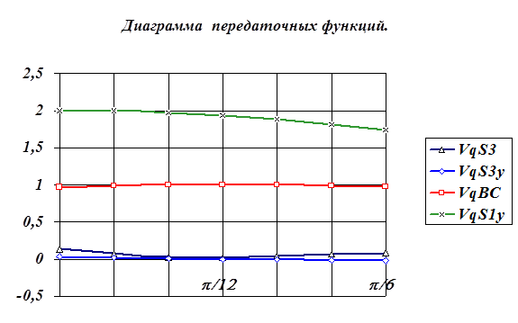 Для последнего пятого векторного контура l AS1 = xS1 + yS1 проекции на оси координат xS1 = lAS1 × cos j1 , yS1 = lAS1 × sin j1 . Производные от этих выражений по j1 VqS1x = lAS1 × sin j1 , VqS1y = lAS1 × cos j1 , позволяют определить первую передаточную функцию ___________ VqS1 = Ö VqS1x2 + VqS1y2 .