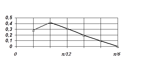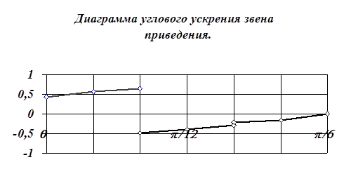 6. Определение углового ускорения звена приведения Для расчета углового ускорения звена приведения e1 = f(j1) можно воспользоваться двумя различными зависимостями: а). e1 = dw1 /dt = dw1/dj1 × dj1/dt = w1 × dw1/dj1 , б). e1 = dw1/dt = М прå/ Iпрå - w12/(2× Iпрå) × (d Iпрå /dj1). Применение первой формулы приводит к большим погрешностям, так как она основывается на использовании одной из конечных зависимостей расчета w1 = f (j1 ). Кроме того, в точках с нулевыми значениями w1 расчет по этой формуле дает неверный результат e1 = 0. Поэтому проведем расчет зависимости e1 = f(j1) по второй формуле. Диаграмма функции e1 = f(j1) приведена на рис. 7.22.