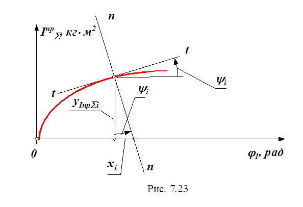 Метод поднормали (графическое определение производной). При определении в формуле углового ускорения производной d Iпрå /dj1 часто используется метод поднормали. На графике дифференцируемой функции (рис. 23) в рассматриваемой точке проводят касательную t - t , нормаль n - n и ординату yIпрåi . Измеряют отрезок xi между точками пересечения с осью x ординаты и нормали. Рассчитывают производную с учетом масштабов по осям по формуле