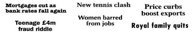 1. BOOK LINKS MI5 WITH KGB 2. CHANCELLOR CUTS INTEREST RATES 3. BOMB BLASTS CENTRAL LONDON 4. PM PLEDGES BACKING FOR EUROPE 5. PRESIDENT HEADS PEACE MOVES