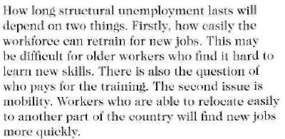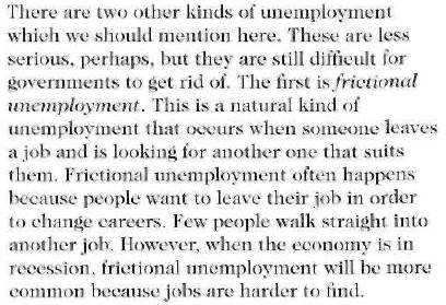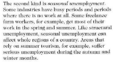 UNEMPLOYMENTDate: 2015-10-07; view: 516. Reading 2 There will always be a certain amount of unemployment in the economy. When economists talk about full employment they mean that everyone who can work and wants to work has a job. Able workers who are not working are simply not happy with the salaries that are offered – or just can't be bothered! However, economies rarely reach full unemployment. There are a number of reasons for this, and a number of different types of unemployment. One of these is cyclical employment. This type of unemployment varies with the growth and recession cycle of the economy. As the economy grows, demand for labour grows and unemployment falls. As the economy contracts, unemployment grows. A second kind of unemployment is structural unemployment. This occurs when changing public tastes or advances in technology cause a fall in demand for some types of work. For example, computer technology has revolutionized the printing industry, and many traditional printers' jobs have become obsolete. Sometimes whole regions of a country suffer from high structural unemployment. The north-east of England, for example, was famous for many years for its shipbuilding industry. Competition from abroad