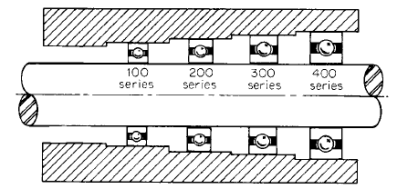 The selection of the type of rolling-contact bearing depends upon many considerations, as evidenced by the numerous types available. Furthermore, each Fig. 2 Bearing standard series. basic type of bearing is furnished in several standard ‘‘series'' as illustrated in Fig.2. Although the bore is the same, the outside diameter, width, and ball size are progressively larger. The result is that a wide range of load-carrying capacity is available for a given size shaft, thus giving designers considerable flexibility in selecting standard-size interchangeable bearings. Some of the more common bearings are illustrated below and their characteristics described briefly.