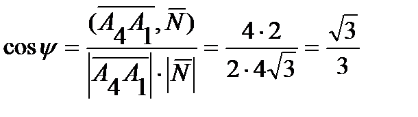 3) угол между гранью и ребром есть угол между наклонной и плоскостью, задаваемой точками . Из чертежа видно (рис.2), что , где - угол между вектором нормали плоскости и направляющим вектором прямой.