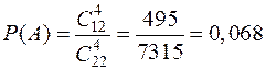 Теперь вернемся к определению классической вероятности события А, вычисляемой по формуле (1). Пример 8. Найти вероятность того, что при бросании трех монет выпадет ровно 2 орла. Пусть событие А — выпадение 2 орлов. Подсчитаем общее число исходов опыта n. Каждая монета может лечь либо орлом (О), либо решкой (Р), т.е. имеется две возможности. По основной теореме комбинаторики общее число исходов Пример 9. В классе 12 мальчиков и 10 девочек. На уроке опрошено четверо учеников. Какова вероятность того, что все они были мальчиками, если опрос любого ученика равновероятен? Будем считать событием